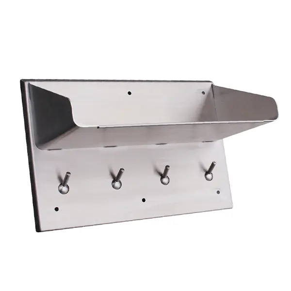 Single collapsible safety hooks or groups of four with optional 8” deep x 18” long bookshelf. Ball and stem style come in stainless only.