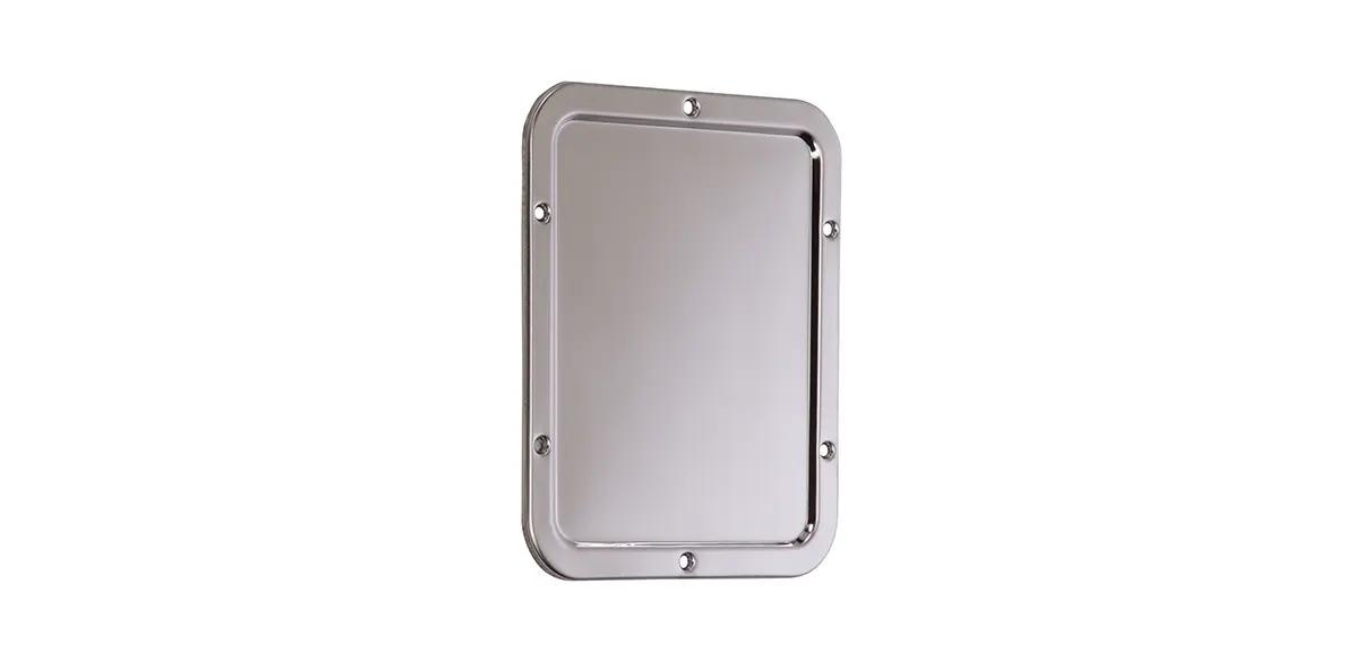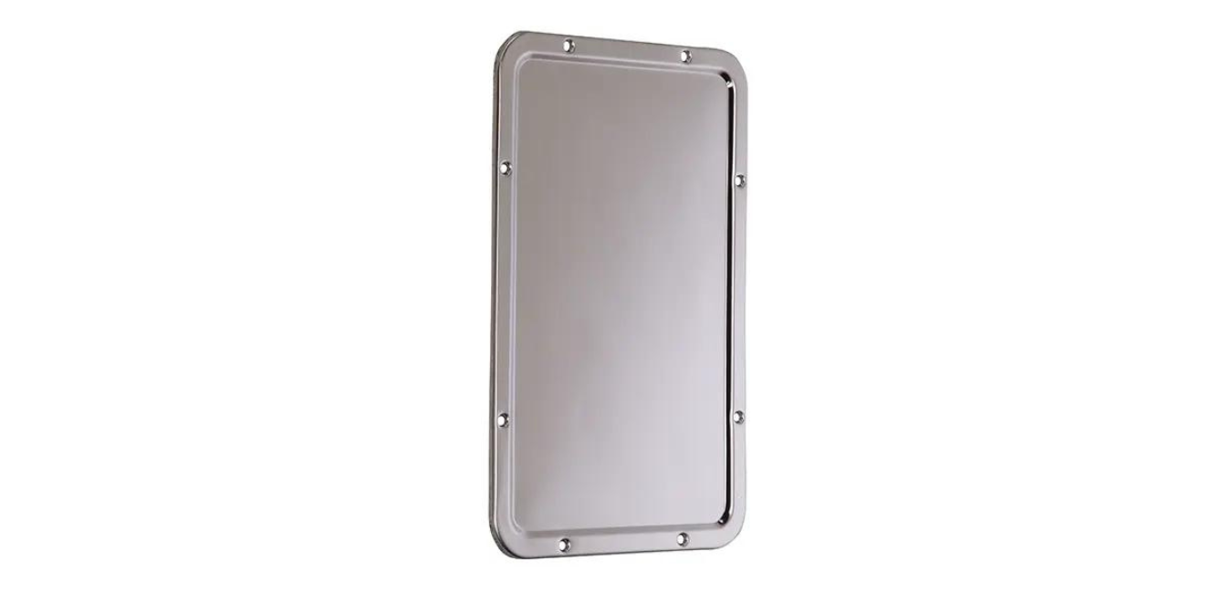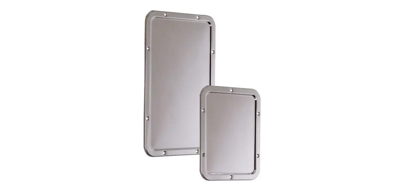 The mirror is one-piece #304 stainless steel. Highly polished #8 finish. Three standard sizes: