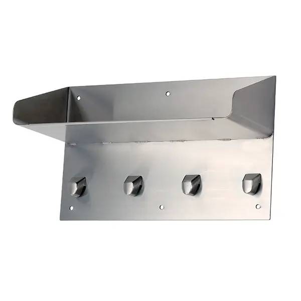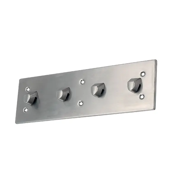This product holds towels or clothing articles safely without the use of protruding pegs or hooks. The surface mounted towel hooks come in stainless steel. Choose from single towel hooks or groups of four.